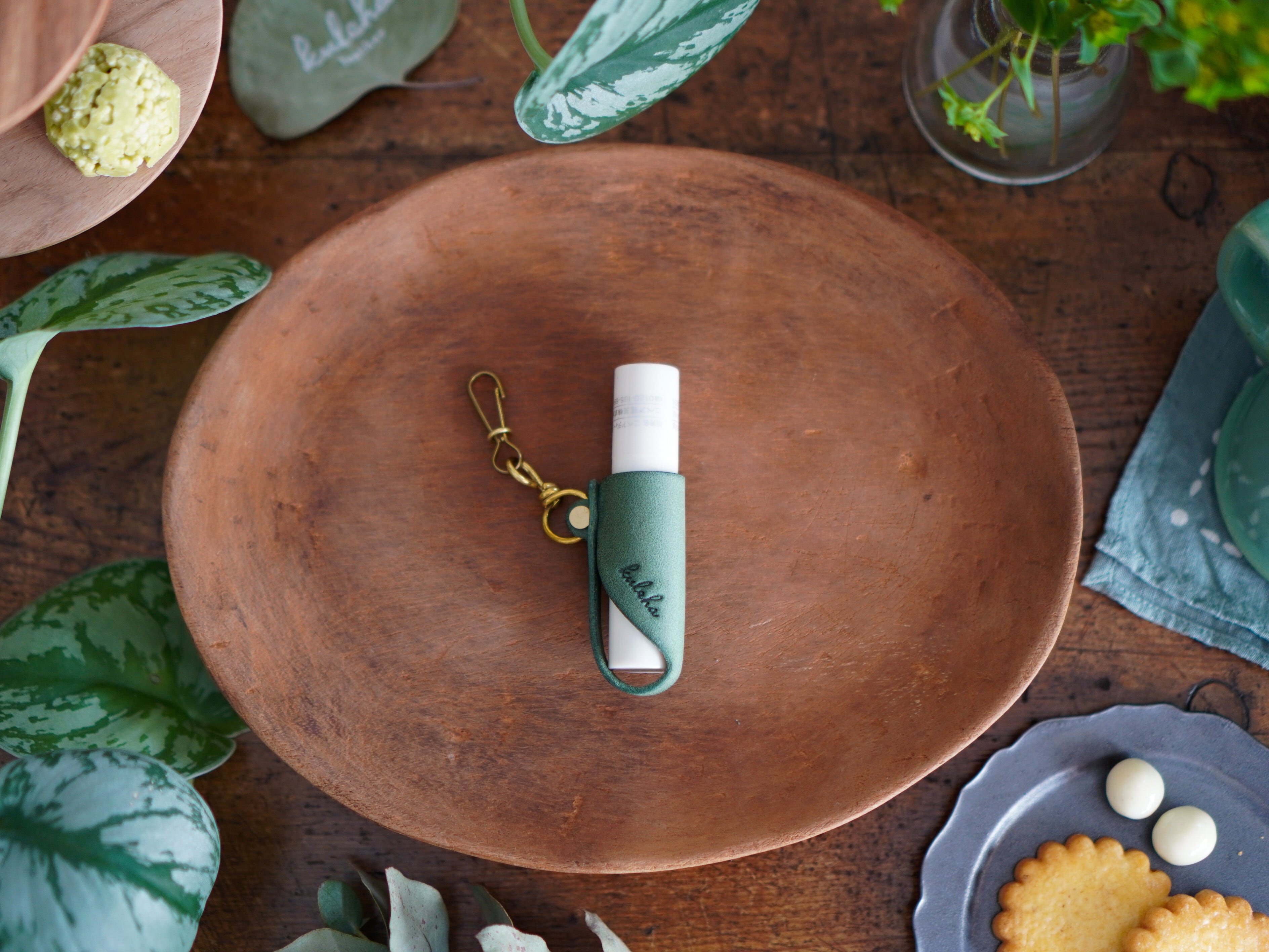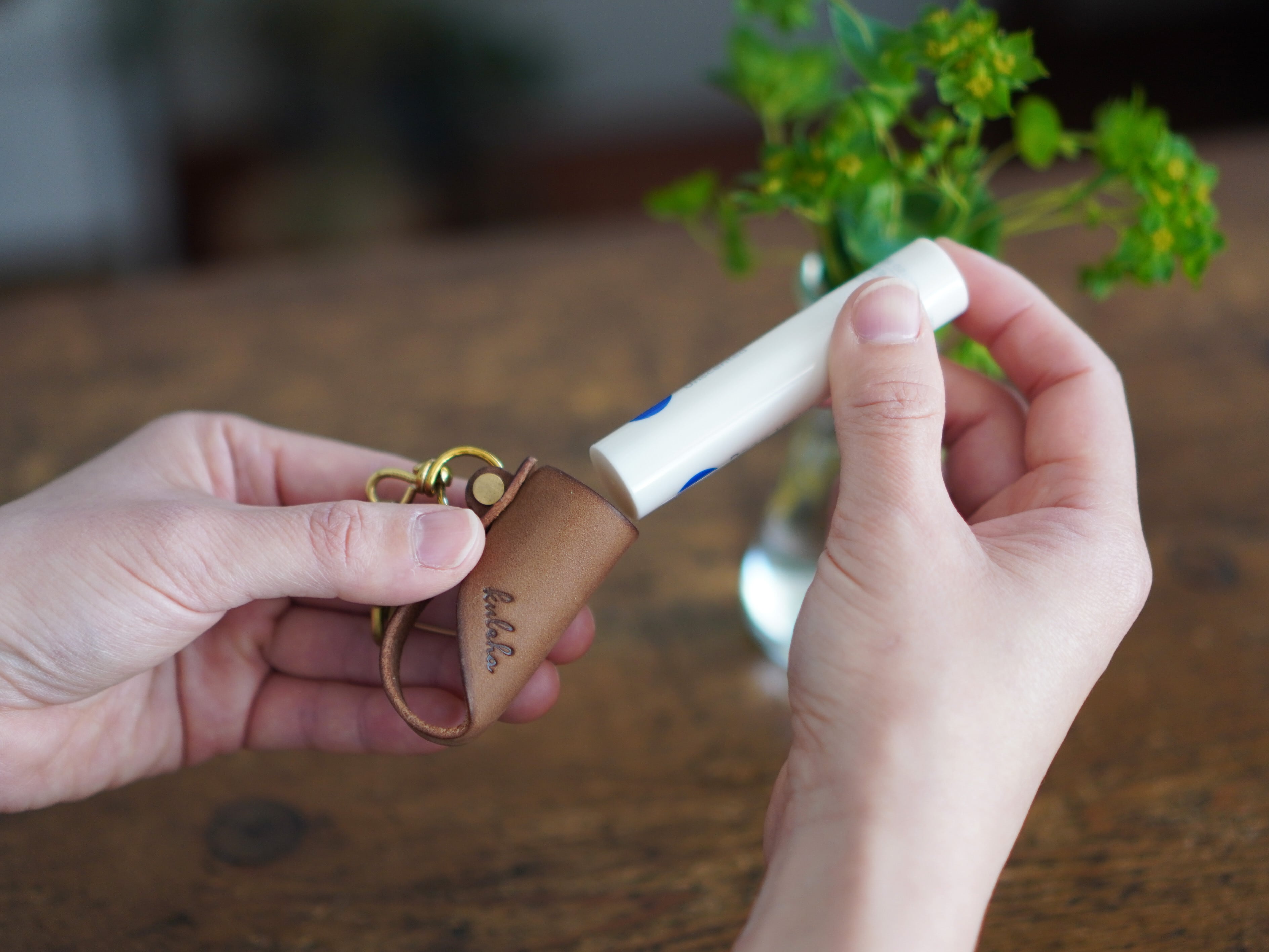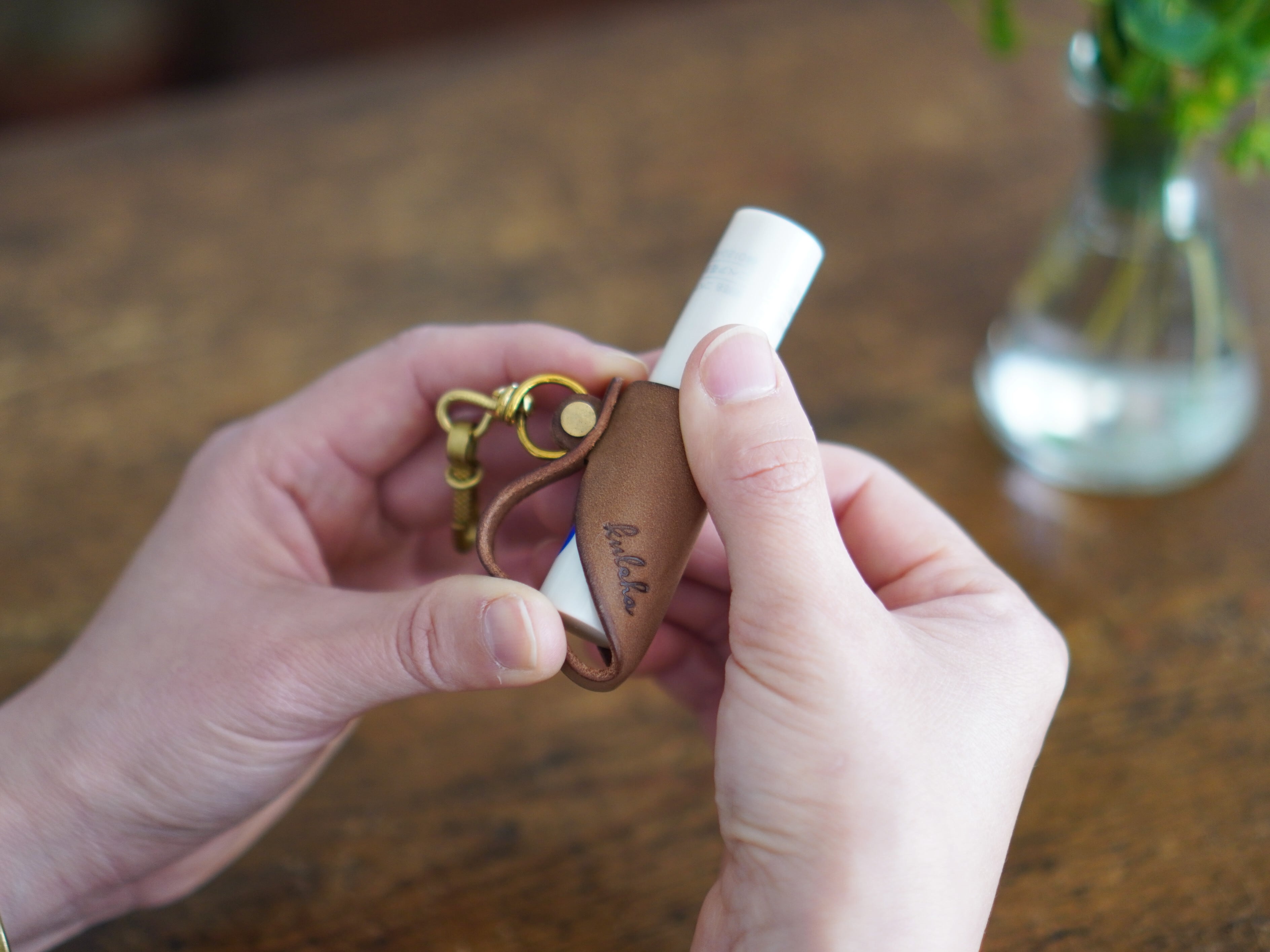 に合わせてお作りしておりますが、ゆるい場合は付属のテープが付いた葉っぱ型の革を、Myチャームの内側またはリップクリームに貼り付け、厚みの調整をしてお使いください。