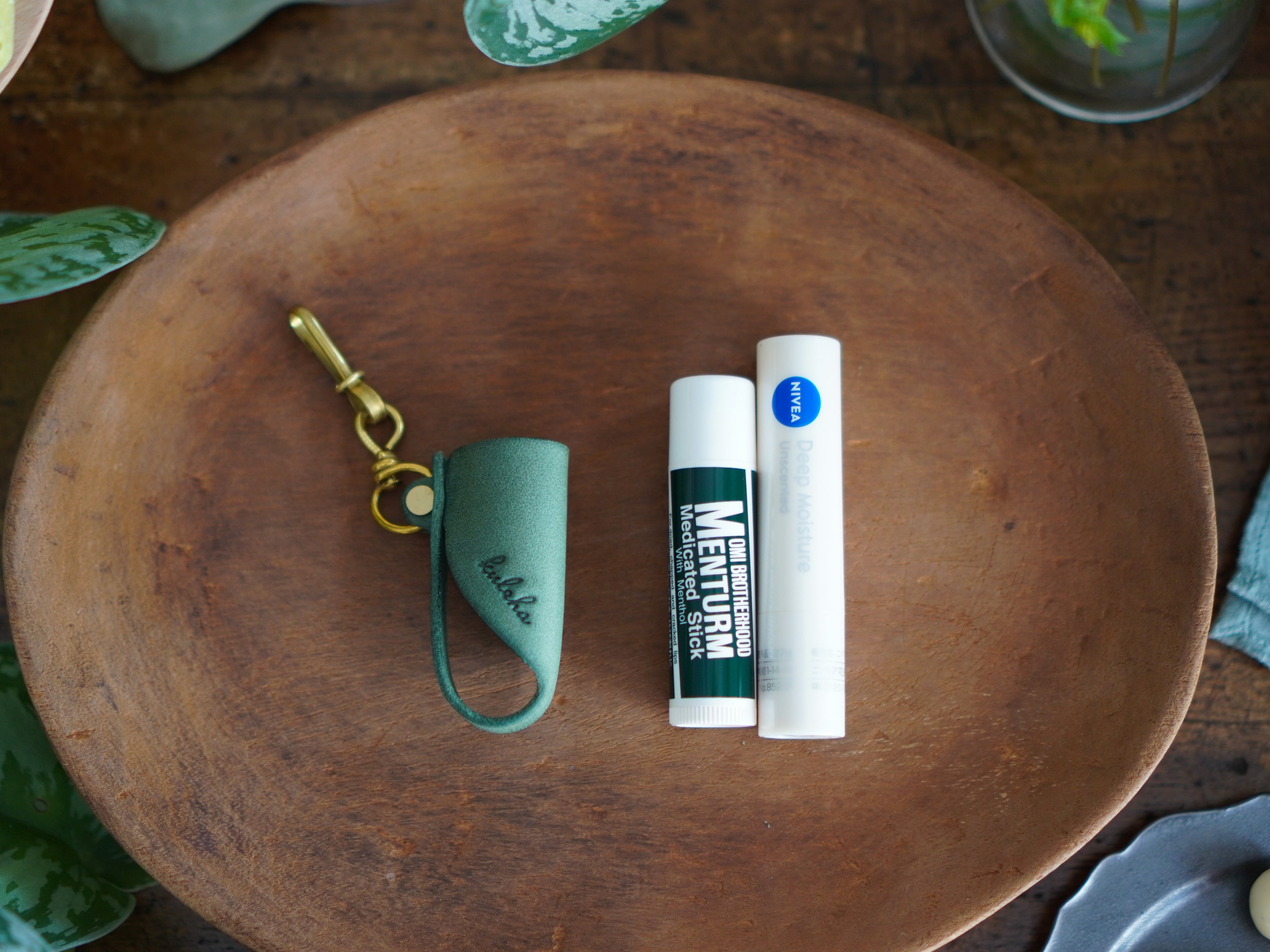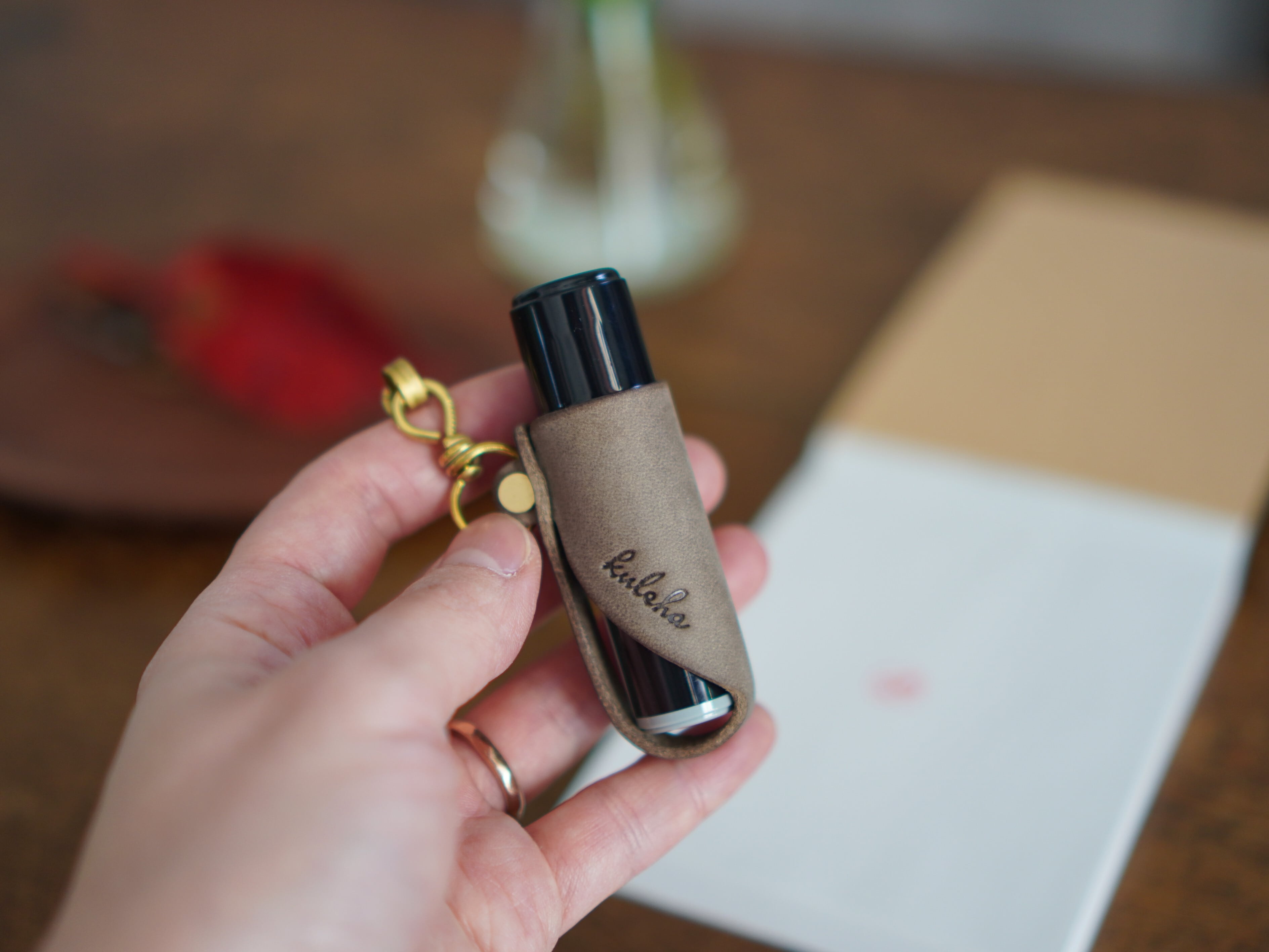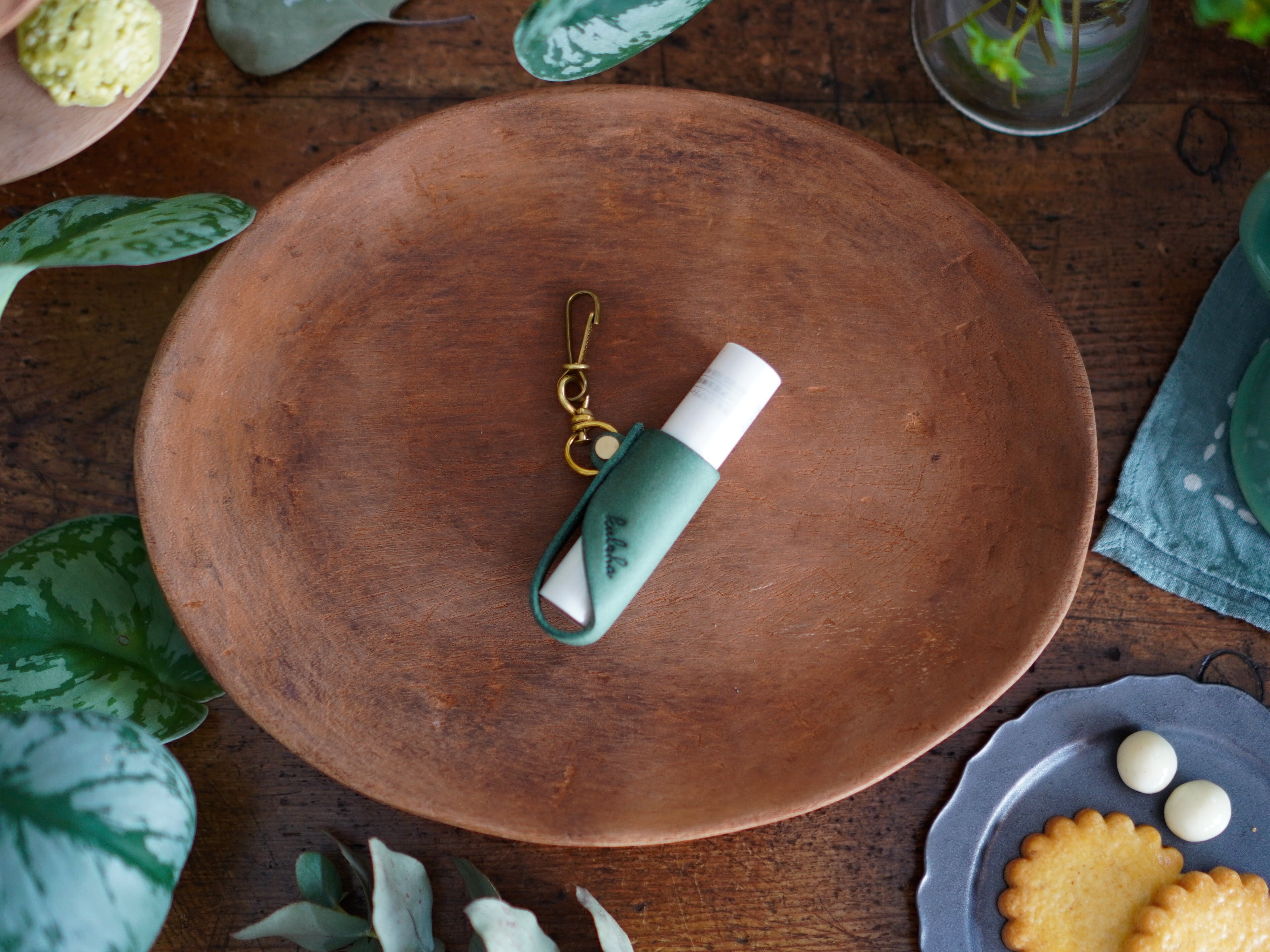 に合わせてお作りしておりますが、ゆるい場合は付属のテープが付いた葉っぱ型の革を、Myチャームの内側またはリップクリームに貼り付け、厚みの調整をしてお使いください。