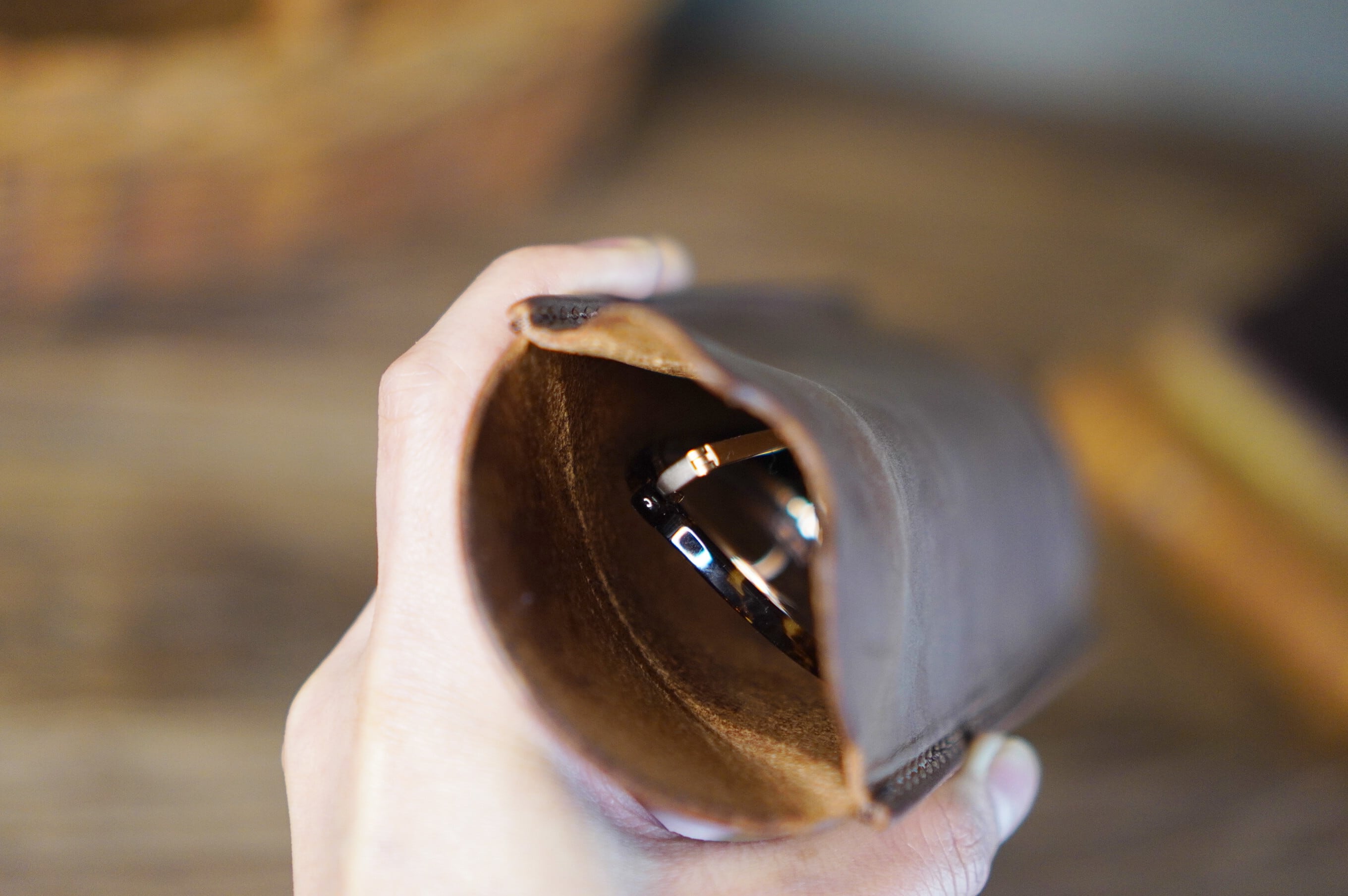 上下どちらからでもメガネが取り出しでき、中身がない時はケースをぺちゃんこにして、お鞄に収納できます。
