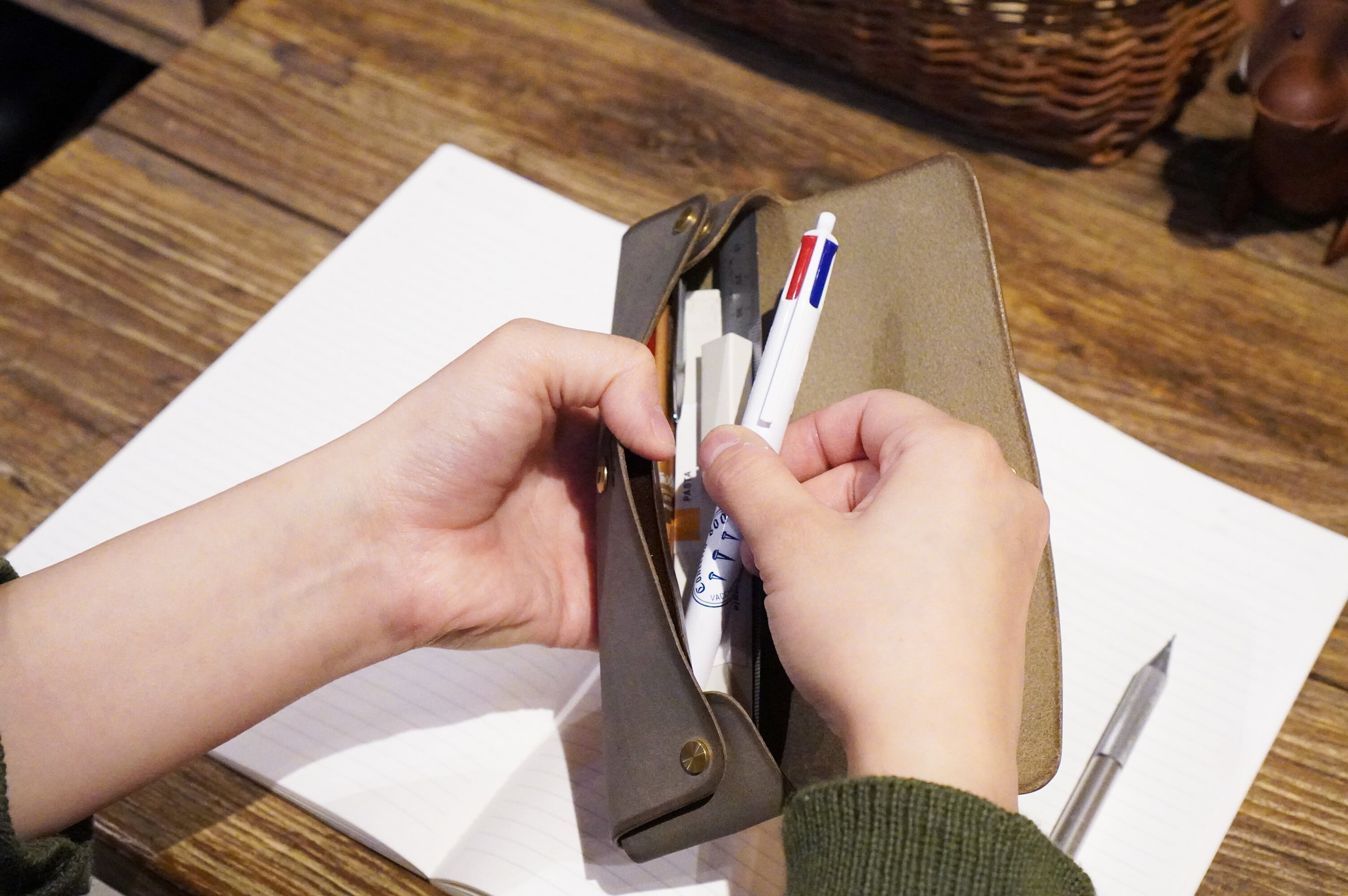 ペンや小さな文房具をすっきり収納できるサイズ感で、ホックを全てはずすとトレイのように、デスクの上で広げることもできます。